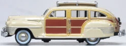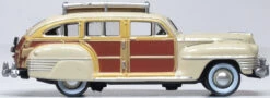 t’s the middle of World War II for this chunky Chrysler Town & Country luxury station wagon which was made between 1941 and 1942 and again after the war and beyond. Our replica of the first generation vehicle from 1942 shows off its unique shape and unusual features. The four door saloon was styled with either a wood body or metal designed to look like wood. Unbelievably, the car could take up to nine people and rear loading was via centrally opening double doors.