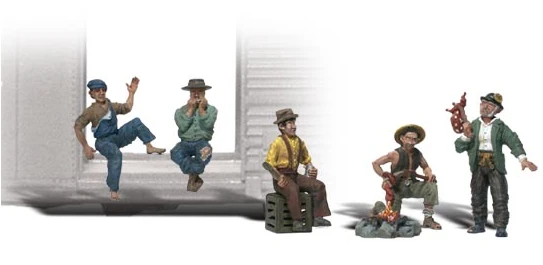 Hobos sitting around. One playing his harmonica, one roasting a hot dog and one standing with his knapsack on a stick.
